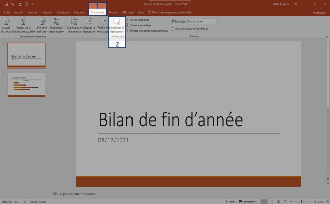 Dans le ruban, cliquez sur Diaporama (1) puis sur Enregistrer le diaporama (2).